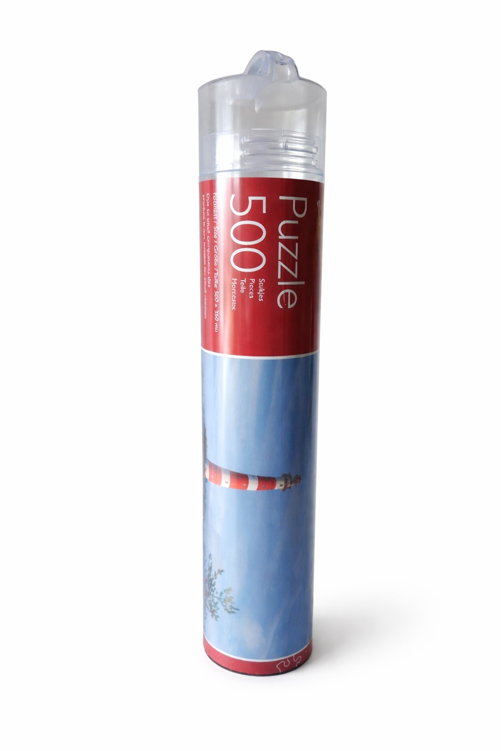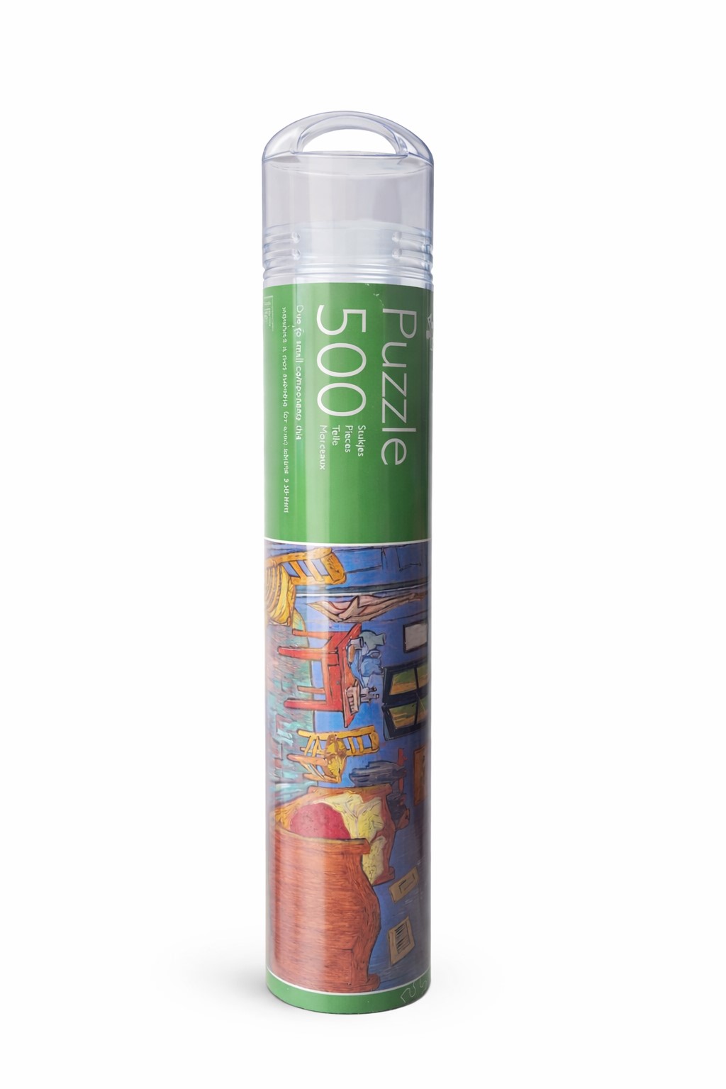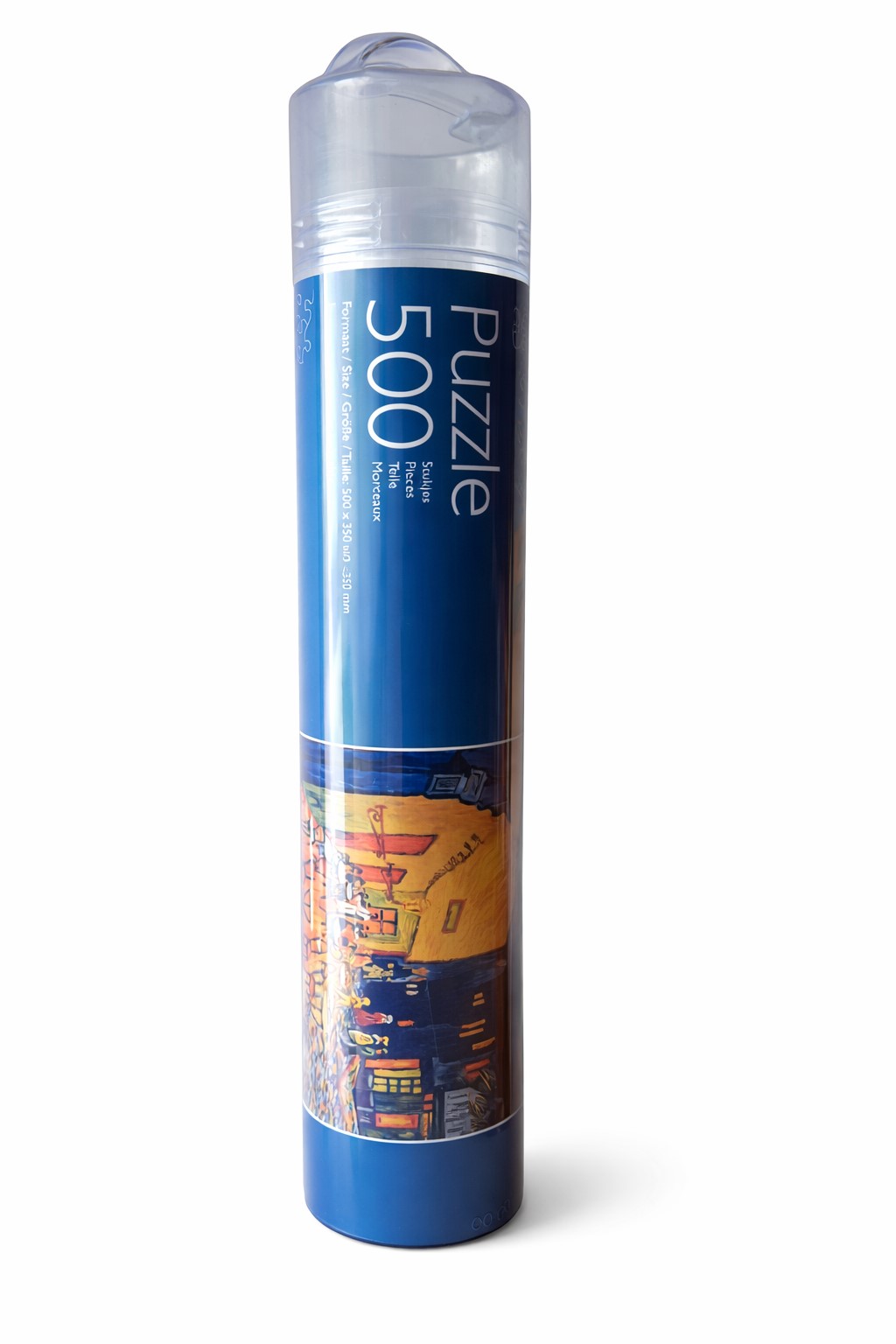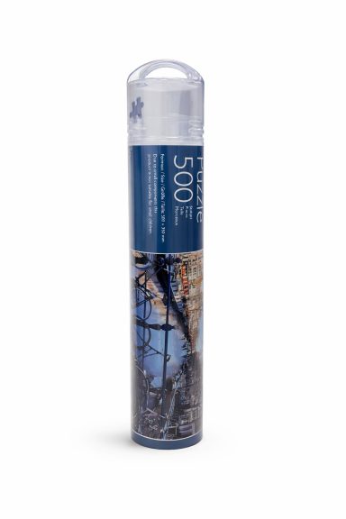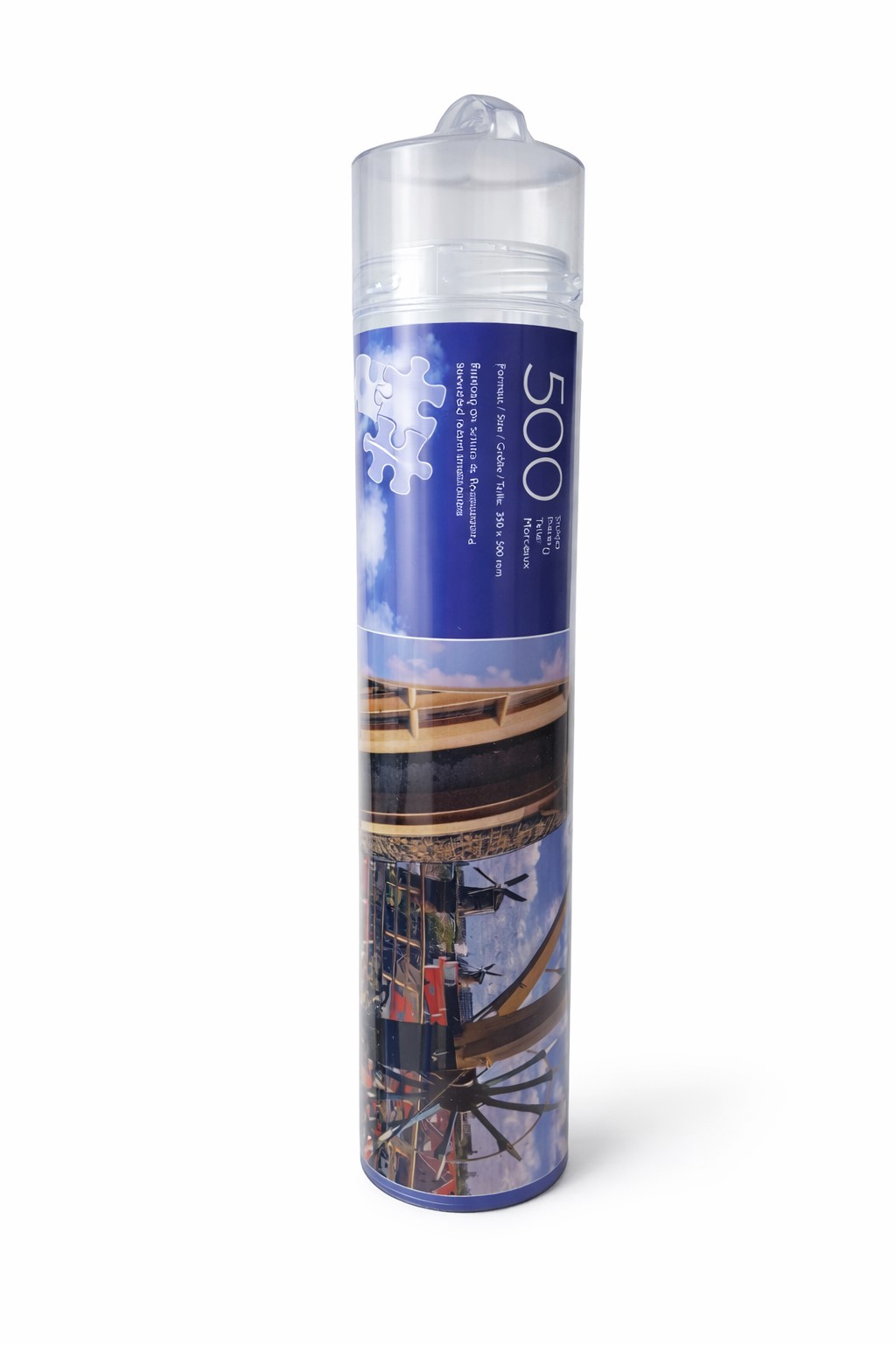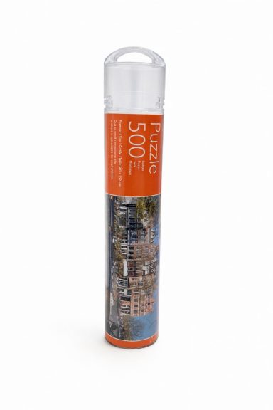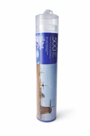 De puzzels zijn verpakt in een stevige, handige plastic koker.